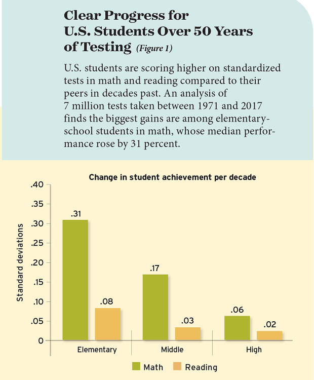 “…[A]verage student achievement has been increasing for half a century. Across 7 million tests taken by U.S. students born between 1954 and 2007, math scores have grown by 95 percent of a standard deviation, or nearly four years’ worth of learning. Reading scores have grown by 20 percent of a standard deviation per decade during that time, nearly one year’s worth of learning.