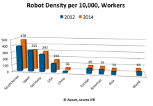 06/01/2017 Robot density per 10,000 people in some of the better-known countries is shown here in a graphic recently published by Asian Robotics Review.